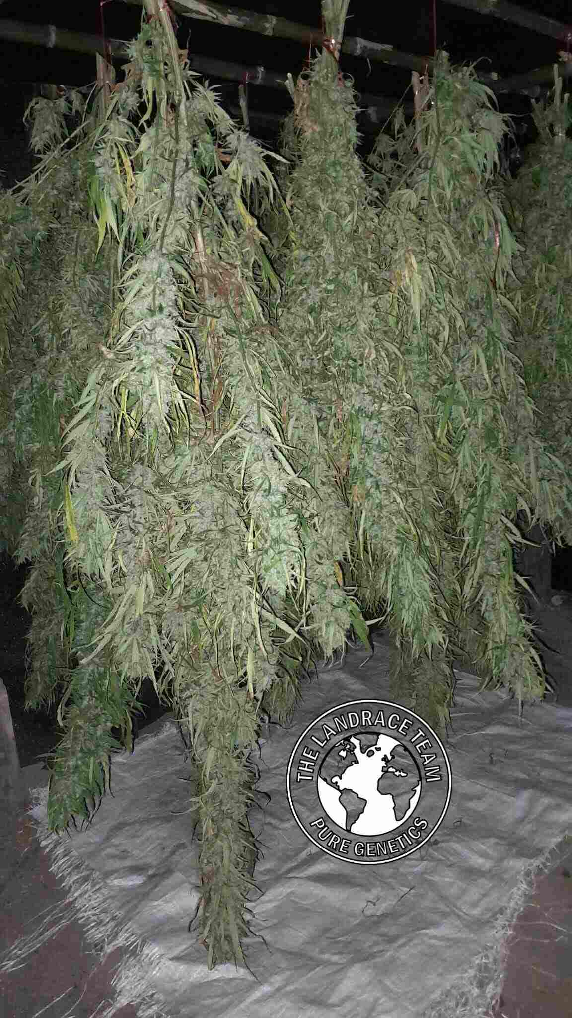 We hang the plants in the shade not under the sun. When the plants are really dry we start shaking them while they are still hanging upside down. We put a tarp on the floor like that the seeds when they fall off and down to the ground we can easily collect them all. Then we check also the plants if there are any more seeds in the buds before curing them and after they’ve been cured.