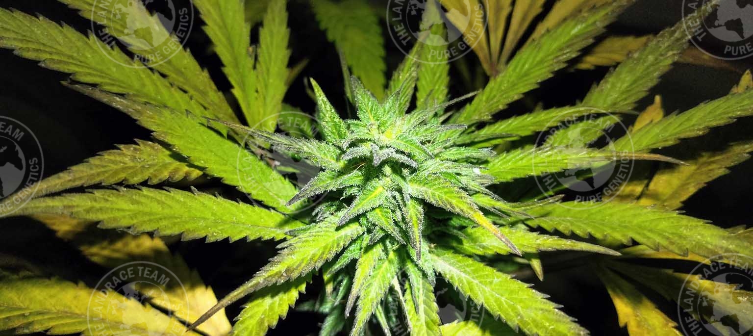 During its early stages of growth, it displays wide leaflets, short internodes, and sturdy, hollow stems. After the first month, it evolves toward a more stylized morphology, with finely serrated leaves reminiscent of classic sativas. The apical tip is crowned with a fan of thin leaves that point skyward, framing dense, compact buds that concentrate all their potency.